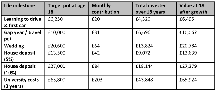 It will be very useful, because even at today’s prices, these milestones cost a lot of money. The table below gives some examples of how much various life events currently cost, and shows how much you would have needed to save over the last 18 years per month to meet these estimated costs. The values assume a 5% growth per year, less a 0.75% annual management charge, but don’t take inflation into account, which over time will erode your spending power as costs rise.